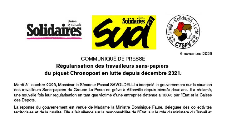 Nos organisations notent que l'intervention de la ministre passe sous silence l'implication de syndicats dans l'organisation de la lutte. A savoir, l'Union syndicale Solidaires et la Fédération SUD PTT. C'est d'ailleurs l'interpellation incessante de la direction de La Poste par la Fédération SUD PTT, en lien avec les grèves de sans-papiers à Alfortville et au Coudray-Montceaux, qui a conduit le Groupe La Poste à rompre, le 5 mai 2022, le contrat qui le liait à son sous-traitant Derichebourg. Derichebourg étant l'employeur de la presque totalité des postiers sans-papiers grévistes sur les deux sites.