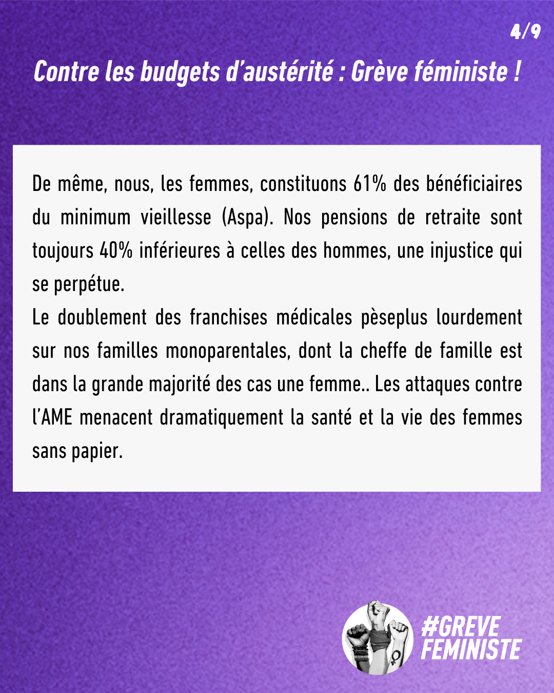 De même, nous, les femmes, constituons 61% des bénéficiaires du minimum vieillesse (Aspa). Nos pensions de retraite sont toujours 40% inférieures à celles des hommes, une injustice qui se perpétue. Le doublement des franchises médicales pèseplus lourdement sur nos familles monoparentales, dont la cheffe de famille est dans la grande majorité des cas une femme.. Les attaques contre l’AME menacent dramatiquement la santé et la vie des femmes sans papier.