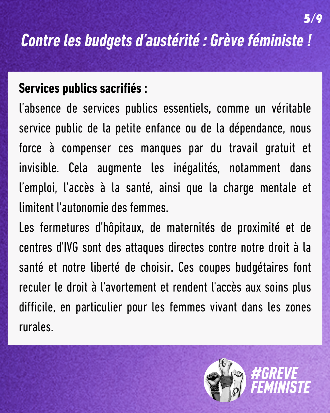 Nous sommes majoritaires dans la fonction publique, et doublement impactées par les politiques budgétaires austéritaires en tant que fonctionnaires et en tant qu’usagères. Nos salaires, le point d’indice, ne sont pas revalorisés. Mais ces politiques d'austérité ne s'arrêtent pas aux fonctionnaires.