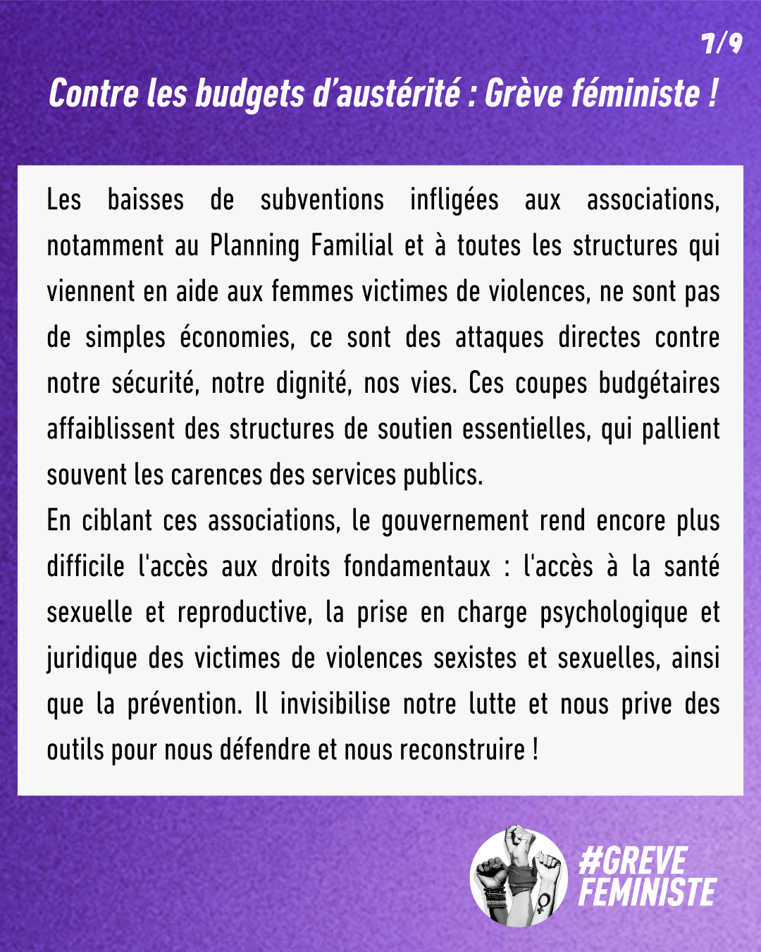 Les baisses de subventions infligées aux associations, notamment au Planning Familial et à toutes les structures qui viennent en aide aux femmes victimes de violences, ne sont pas de simples économies, ce sont des attaques directes contre notre sécurité, notre dignité, nos vies. Ces coupes budgétaires affaiblissent des structures de soutien essentielles, qui pallient souvent les carences des services publics. En ciblant ces associations, le gouvernement rend encore plus difficile l'accès aux droits fondamentaux : l'accès à la santé sexuelle et reproductive, la prise en charge psychologique et juridique des victimes de violences sexistes et sexuelles, ainsi que la prévention. Il invisibilise notre lutte et nous prive des outils pour nous défendre et nous reconstruire