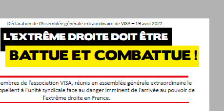 L’extrême droite est maintenant très implantée dans le paysage politique français, et elle gagne du terrain. VISA appelle l’ensemble des syndicats à travailler en commun, à tous les niveaux, pour combattre l’extrême droite, aujourd’hui et demain.