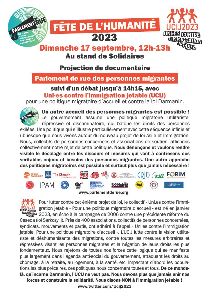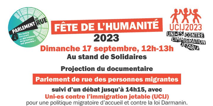 Dimanche 17 septembre, 12h-13h au stand de Solidaires projection du documentaire Parlement de rue des personnes migrantes suivi d’un débat jusqu’à 14h15, avec Uni-es contre l’immigration jetable (UCIJ) pour une politique migratoire d’accueil et contre la loi Darmanin.