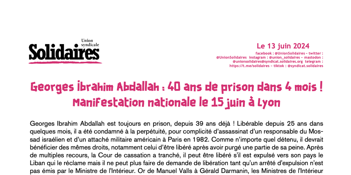 Une manifestation nationale aura lieu à Lyon, le samedi 15 juin 2024 à 14h, pour la libération de Georges Abdallah et soutenir deux de ses partisans lyonnais poursuivis le 18 juin pour être intervenus en interrom- pant un match en solidarité avec Georges Abdallah.