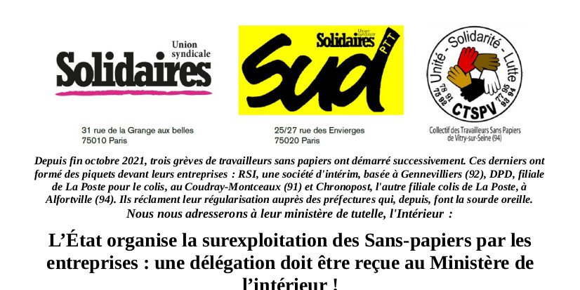 Depuis fin octobre 2021, trois grèves de travailleurs sans papiers ont démarré successivement. Ces derniers ont formé des piquets devant leurs entreprises : RSI, une société d'intérim, basée à Gennevilliers (92), DPD, filiale de La Poste pour le colis, au Coudray-Montceaux (91) et Chronopost, l'autre filiale colis de La Poste, à Alfortville (94). Ils réclament leur régularisation auprès des préfectures qui, depuis, font la sourde oreille. Nous nous adresserons à leur ministère de tutelle, l'Intérieur