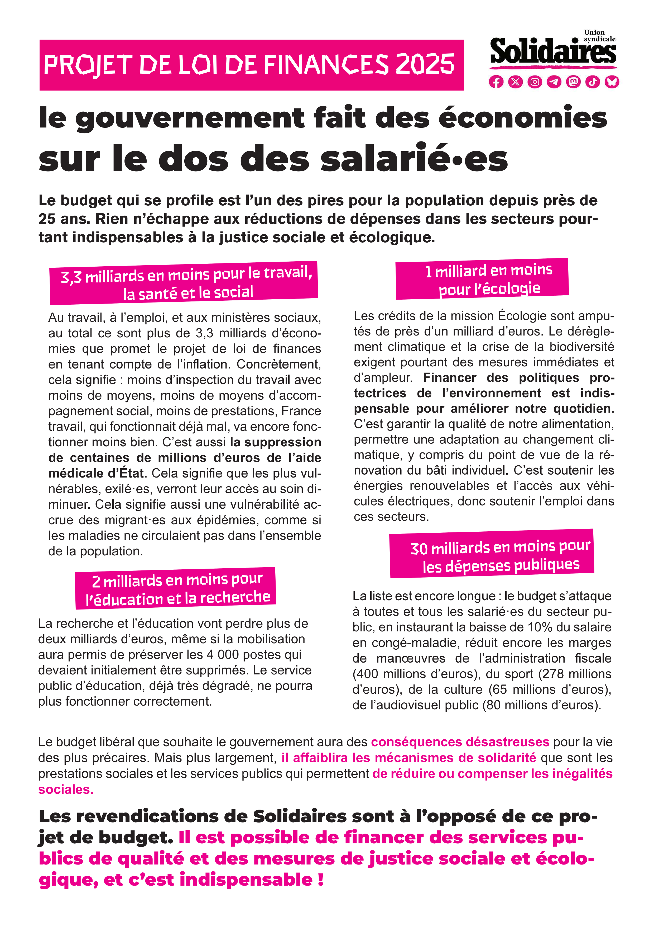 Les revendications de Solidaires sont à l’opposé de ce projet de budget : il est possible de financer des services publics de qualité et des mesures de justice sociale et écologique, et c’est indispensable !