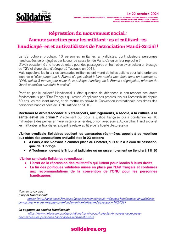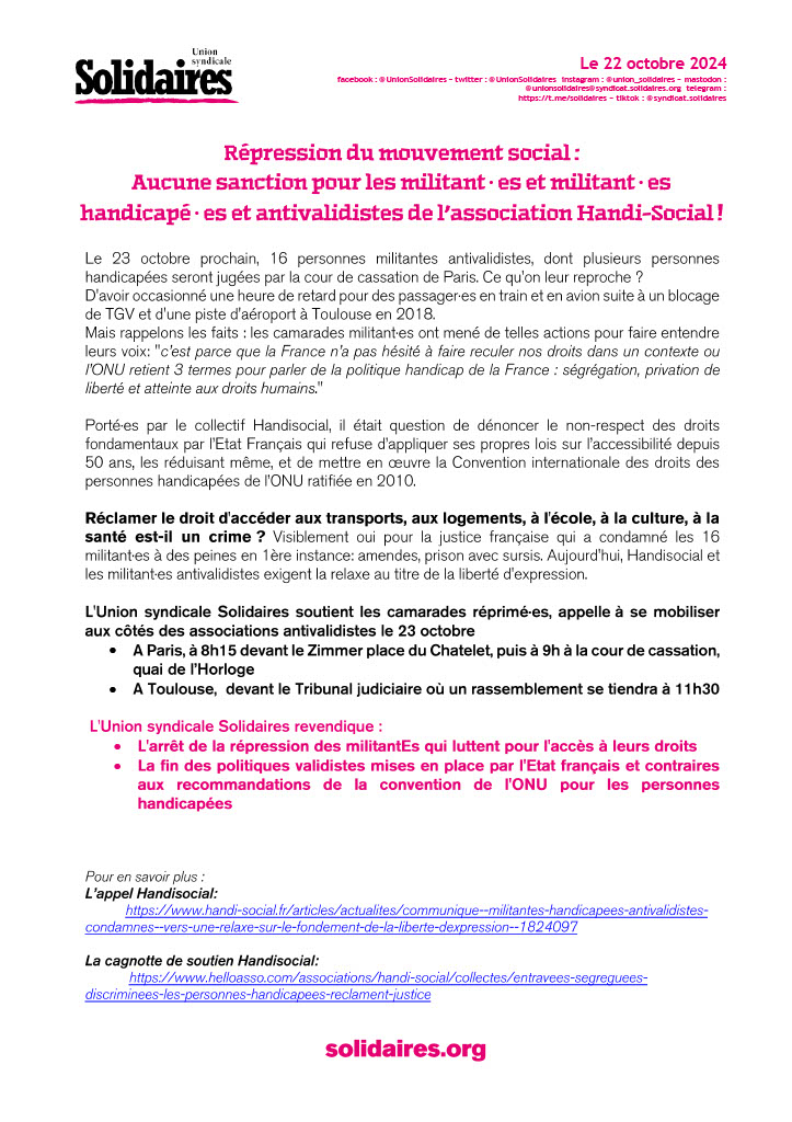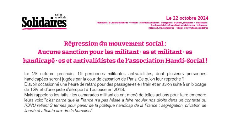 L'Union syndicale Solidaires soutient les camarades réprimé∙es, appelle à se mobiliser aux côtés des associations antivalidistes le 23 octobre