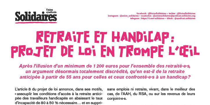 Au contraire de l’allongement de l’âge légal de départ à la retraite et du nombre d’annuités souhaité par ce gouvernement, et afin d’assurer une bonne retraite à chacun·e, Solidaires exige la mise en œuvre d’une réelle compensation liée aux handicaps, avec l’amélioration significative des carrières et des conditions de travail. C’est aussi la meilleure réponse à donner aux travailleuses et travailleurs usé·es par la pénibilité de leurs emplois.
