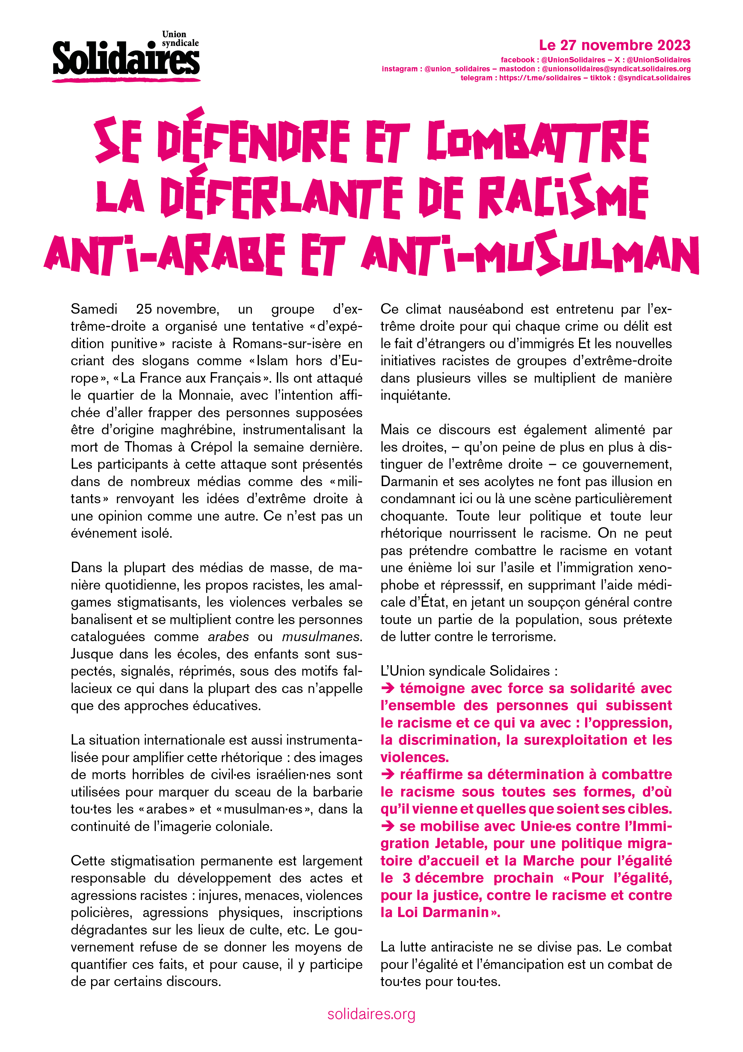 • témoigne avec force sa solidarité avec l’ensemble des personnes qui subissent le racisme et ce qui va avec : l’oppression, la discrimination, la surexploitation et les violences.