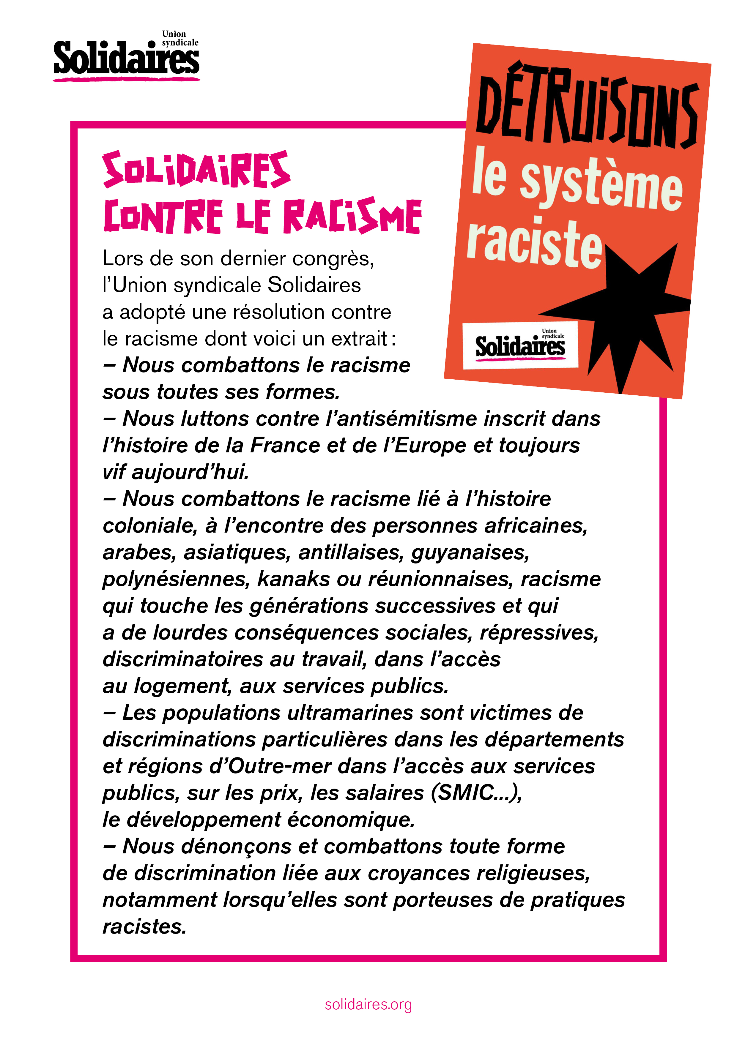 Lors de son dernier congrès, l’Union syndicale Solidaires a adopté une résolution contre le racisme dont voici un extrait :