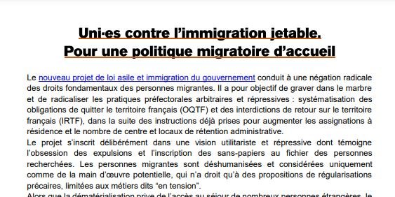 ACCOSOR Aide aux réfugiés GARD, Accueil Goutte d'Or, Accueil migrants vallée du Doux , Accueil Solidaire en Roannais, Ah Bienvenue Clandestins ! ABC’éditions, AHSETI Le Havre, Amnesty international, Amoureux au ban public, Amoureux au ban public Strasbourg, ARS (auderefugiéessolidarité), Assemblée Citoyenne des Originaires de Turquie - L'ACORT, Assemblée féministe de Montreuil , Association "Collectif Solidarité Réfugiés Sisteron", Association Accueil Migrants Vallée du Doux, Association Bagagérue , Association Carré Géo & Environnement France, Association des Travailleurs Maghrébins de France (ATMF), Association ECNou (Aide et soutien aux exilés en situation d’urgence), Association EcolesTiersMondes46, Association ensemble Marseille 13 , Association française des juristes démocrates, Association France Palestine Solidarité Nîmes, Association Montagne Accueil Solidarité, association Rayon de Soleil, Association Solidarité RESF47, ATPAC Maison Solidaire, Attac France, Auberge Des Migrants, Baugeois Solidarité Réfugiés (BSR), Bénévoles Engagés pour la Promotion des Droits de l'Homme ( BEPDH), Blog "entre les lignes entre les mots", Cabiria, CCFD-Terre solidaire, délégation de Marseille, CEDETIM-IPAM, Cercle des Voisins du CRA de Cornebarrieu, CGT, La Cimade, Cimade 66, Cimade Besancon, Cimade Figeac, Citoyennes et citoyens des 6&8 pour une ville plus juste, plus verte, plus démocratique, Citoyens pour la Cohésion sociale, CIVCR Collectif Ivryen de Vigilance Contre le Racisme, CNT-Solidarité Ouvrière, Collectif Accueil Migrants Barbezieux, Collectif AGIR du Pays d'Aix, Collectif amiénois des sans-papiers, Collectif AERéSP28 (pour l'accueil des exilés et la régularisation des sans-papiers d'Eure et Loir), Collectif Agir Aix en Provence, Collectif de Soutien aux Migrants du Goëlo (CSMG), Collectif des Travailleurs Sans-Papiers de Vitry (CTSPV), collectif Fontenay diversité, Collectif Granville 2020, Collectif Le Pont Martigues (13) Aide à la santé des exilés.ées, Collectif Migrants 83, Collectif MMR 79, Collectif pour l'Égalité des droits, Collectif pour l'Égalité des droits Bordeaux rive droite, Collectif Strasbourgeois pour une autre politique migratoire, Collectif urgence sociale, Collectif vigilance pour les droits des étrangers Paris 12eme, Le Comede, Comité Anti Expulsion de Saintes, Comité contre le racisme de Gerardmer, Comité SOS Racisme de la Vienne, Confédération Paysanne, Coordination nationale Pas sans Nous, Coordination des sans papiers paris (CSP75), CORENS (collectif régional pour la Coopération Nord-Sud (Hauts de France), COVIAM, COVIAM Nice, CSF, CSLAM (Collectif saint-lois d'aide aux migrants), Emmaüs France, FASTI - Association ASTI de Colombes 92, CRID, Fédération SUD Santé-Sociaux, FEMMES DE LA TERRE, Femmes Egalité, Fondation Frantz Fanon, Fondation Maison des champs ACT94, Futur Au Présent - International, GREF Angers, Groupe Accueil et Solidarité, Habitat&Citoyenneté Nice 06, jamais sans toit en Trégor, L’occasion solidaire, La MIF (militant·es pour l'interdiction des frontières), Laboratoire nio far, Ligue des Droits de l'Homme LDH, LDH Boulogne sur mer, LDH Charleville-Mézières -ARDENNES, LDH fédération du pas de calais, LDH Nîmes, LDH Saint-Etienne, LDH Section Meudon-Sèvres-Clamart, LDH St Nazaire, LDH Toulouse, Le LABORATOIRE Nio Far, Les amoureux au ban public bergerac, Les utopistes en Action , Maison de Hospitalité Martigues, Maison du peuple en colère, Marche des Solidarités, Médecins du Monde, Mémoires en marche, Marseille , Migraction Roubaix, MORLAIX-LIBERT2S, Mouvement contre le Racisme et pour l'Amitié entre les Peuple (MRAP)s, Pantin solidaire, Paris d’Exil, Plateforme CARDAV collectifs pour l'accueil des refugié.es en Drôme Ardèche Vaucluse, Quazar, centre LGBTI+ d'Angers et du Maine-et-Loire, RASM, Reconnect, Réseau Education Sans Frontières RESF, RESF Arles, RESF 06, Resf 51 / HeSoPE 51 (hébergeurs solidaires et parrains engagés) / Eole, RESF 56, RESF61, Réseau Hospitalité, Réseau Hospitalité Hautes-Alpes, Résister Aujourd'hui, Rosmerta, Roya citoyenne, SOLIDARITE JEAN MERLIN, Solidarités Asie France (SAF), Solidarité Migrants Graulhet, Sporting Club International Villeurbanne, Syndicat des Avocats de France, Tous-tes En Classe 31 (TEC31), Tous Migrants 73, TousMigrants, Briançon, Transhumances, Tremplin Gironde, UJFP - Union Juive Française pour la Paix, Union Nationale des Etudiants de France (UNEF), Union syndicale Solidaires, Union Syndicale Solidaires 31, Union syndicale Solidaires 35