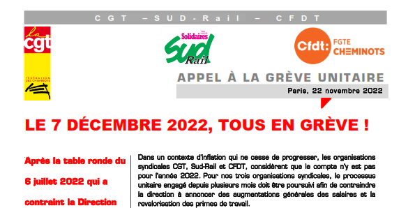 Depuis plusieurs mois, la fédération SUD-Rail ne lâche rien sur le dossier des salaires dans le ferroviaire. Dans l'intérêt des cheminotes et cheminots, nous privilégions l'unité syndicale d'action. Le 7 décembre, la direction SNCF a été contrainte d'organiser une nouvelle rencontre NAO 2022. Les fédérations SUD-Rail - CGT - CFDT ont décidé de mettre la pression sur cette négociation.