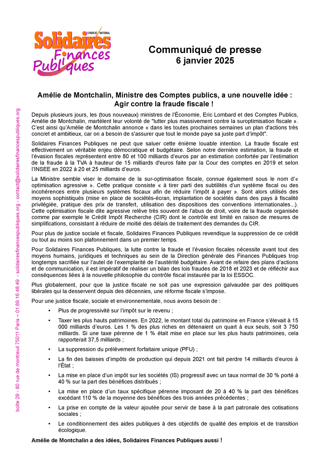 Solidaires Finances Publiques ne peut que saluer cette énième louable intention. La fraude fiscale est effectivement un véritable enjeu démocratique et budgétaire. Selon notre dernière estimation, la fraude et l’évasion fiscales représentent entre 80 et 100 milliards d’euros par an estimation confortée par l’estimation de la fraude à la TVA à hauteur de 15 milliards d'euros faite par la Cour des comptes en 2019 et selon l’Insee en 2022 à 20 et 25 milliards d’euros.
