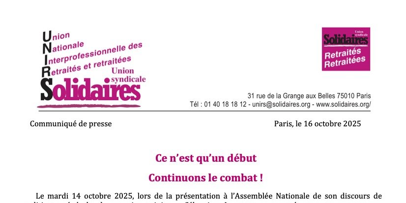 Communiqué de presse des retraité·es de Solidaires (Union Nationale des Retraitées et retraités de Solidaires). Il s'oppose aux régressions sociales, notamment pour les personnes en retraite, prévues par le gouvernement Bayrou et reprises par le gouvernement Lecornu bis.