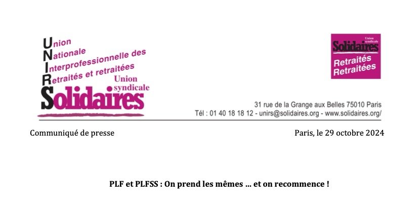 C’est une partie du discours que tiendront les militantes et les militants de l’UNIRS lors de leurs prochaines rencontres avec les élu.es de la République dans le cadre de la préparation de la journée nationale de manifestation des personnes retraitées le 3 décembre à l’appel des 9 organisations de retraité.es. Nous manifesterons pour une autre politique budgétaire, pour le renforcement des services publics, dont ceux du soin et de la santé, pour le renforcement de la sécurité sociale et pour l’indexation totale et entière de toutes les retraites sur l’inflation dès le 1er janvier 2025.