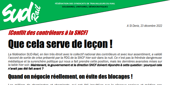 La fédération SUD-Rail, en lien très étroit avec le collectif national des contrôleurs et avec leur assentiment, a validé l’accord de sortie de crise présenté par la PDG de la SNCF hier soir dans la nuit. Ce n’est pas la frénésie dangereuse médiatique et la surenchère politique qui nous a fait prendre cette position, mais les dernières avancées mises sur la table hier soir. Maintenant, le gouvernement et la direction SNCF doivent répondre à cette question : pourquoi cela n’avait pas été fait avant ?