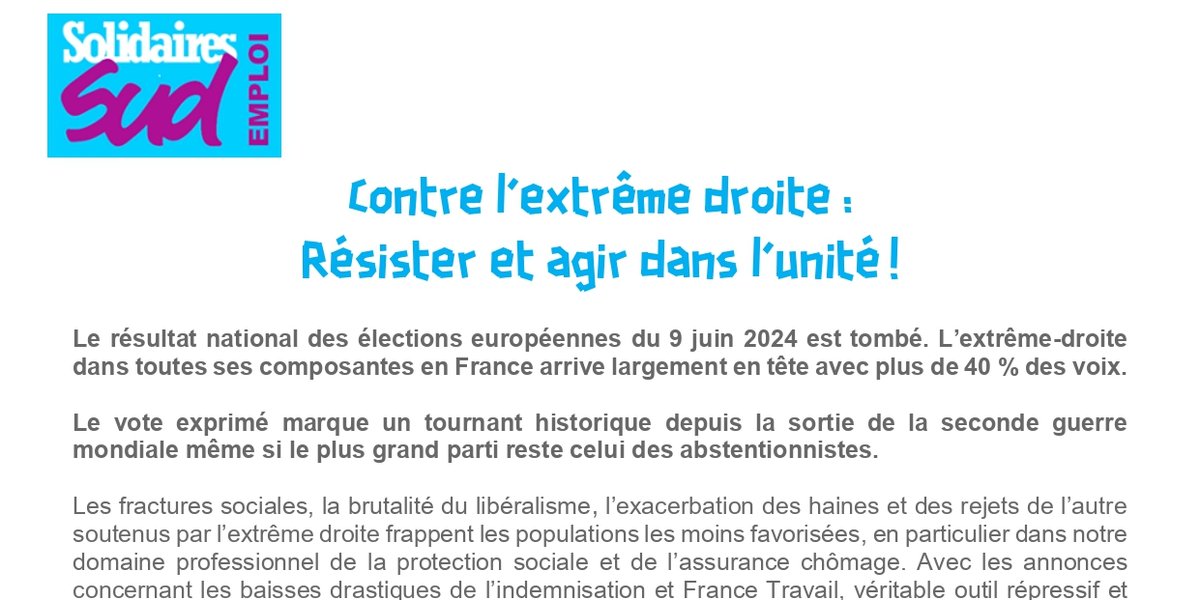 Solidaires Sud Emploi dénonce depuis des années et continuera de dénoncer les risques et conséquences de ces politiques gouvernementales. Nous affirmons que les idées d’extrême droite portées par le Rassemblement national et Reconquête ne seront jamais des solutions aux difficultés rencontrées par la population.