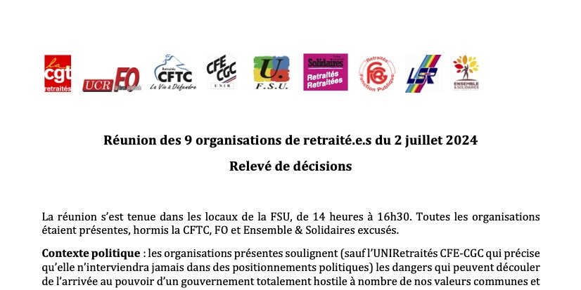 Prochaine réunion des 9 organisations de retraité.es : mardi 3 septembre 2024, à 14 heures, à la FSU.