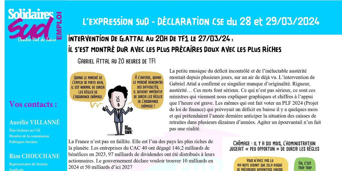 De l’argent, il y’en a ! Pourtant ce gouvernement fait le choix de s’en prendre aux travailleurs et travailleuses privé-es d’emploi, à celles et ceux qui ont déjà le moins, qui plus est en les stigmatisant. Un an après la réforme des retraites imposée contre la volonté de la grande majorité de la population, Gabriel Attal va jusqu’à ouvrir la porte à un nouveau durcissement y compris pour les privé-es d’emploi les plus âgé-es. Solidaires SUD Emploi ne laissera pas le rouleau-compresseur libéral détruire tous nos acquis sociaux sans réagir.
