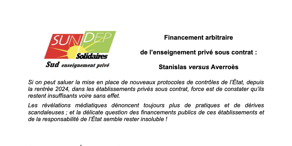 « De quoi les lycées Averroès et Stanislas sont-ils le nom ? ou Comment la domination de classe se joue au sein des établissements privés sous contrat », 26 janvier 2024, sur le site du Sundep-Solidaires ;