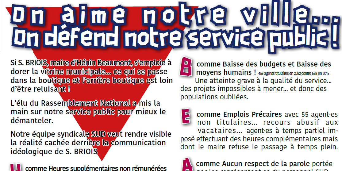 Si S. BRIOIS, maire d’Hénin Beaumont, s’emploie à dorer la vitrine municipale... ce qui se passe dans la boutique et l’arrière boutique est loin d’être reluisant ! L’élu du Rassemblement National a mis la main sur notre service public pour mieux le démanteler.