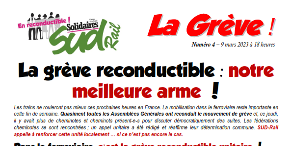 Les trains ne rouleront pas mieux ces prochaines heures en France. La mobilisation dans le ferroviaire reste importante en cette fin de semaine. Quasiment toutes les Assemblées Générales ont reconduit le mouvement de grève et, ce jeudi, il y avait plus de cheminotes et cheminots présent-e-s pour discuter démocratiquement des suites. Les fédérations cheminotes se sont rencontrées ; un appel unitaire a été rédigé et réaffirme leur détermination commune. SUD-Rail appelle à renforcer cette unité localement … si ce n’est pas encore le cas.