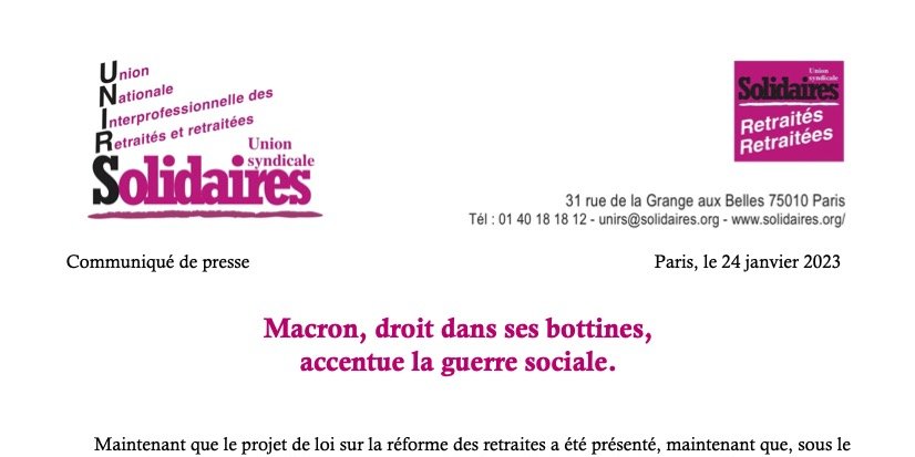 On continue, avec les manifestations du mardi 31 janvier 2023 auxquelles l’UNIRS et les autres organisations de retraité.e.s appellent à participer.