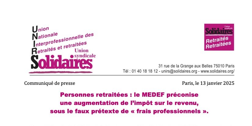 Communiqué de presse de l’UNIRS qui rejette la demande du MEDEF d’augmenter l’impôt sur le revenu des personnes retraitées en leur supprimant l’abattement de 10% appliqué pour le calcul de leur impôt sur le revenu. Le président du MEDEF fait circuler une « fake news » en déclarant que cet abattement de 10% porte sur des « frais professionnels », ce qui lui permet ensuite de s’offusquer que des personnes qui ne travaillent pas puissent déduire des « frais professionnels ». Il ment ouvertement. Il sait, ou ses conseillers, au moins, le savent, que cet abattement à une origine toute autre : il s’agit d’une distinction faite en 1959 pour l’imposition de l’ensemble des revenus à l’impôt sur le revenu entre les revenus qui sont par ailleurs déclarés au fisc par des tiers (en l’occurrence les caisses de retraite) et les autres revenus, particulièrement les revenus des adhérents du MEDEF pour lesquels il y a souvent un grand écart entre ce qu’ils déclarent au fisc et ce qu’ils gagnent réellement. Pour rappel, la fraude fiscale coûte chaque année au budget de l’État entre 100 et 150 milliards d’euros, et les personnes retraitées, en ce qui concerne leurs pensions, y sont pour zéro ou presque.