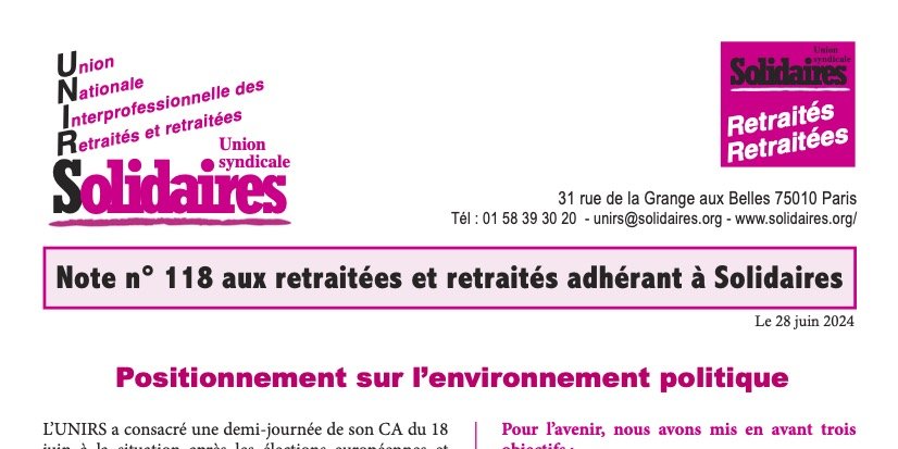 Note mensuelle de l'UNIRS de juin 2024