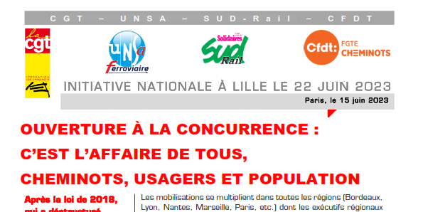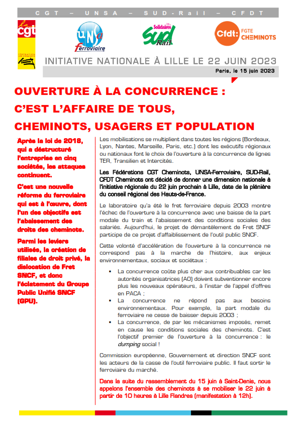 Les Fédérations CGT Cheminots, UNSA-Ferroviaire, SUD-Rail, CFDT Cheminots ont décidé de donner une dimension nationale à l’initiative régionale du 22 juin prochain à Lille, date de la plénière du conseil régional des Hauts-de-France.