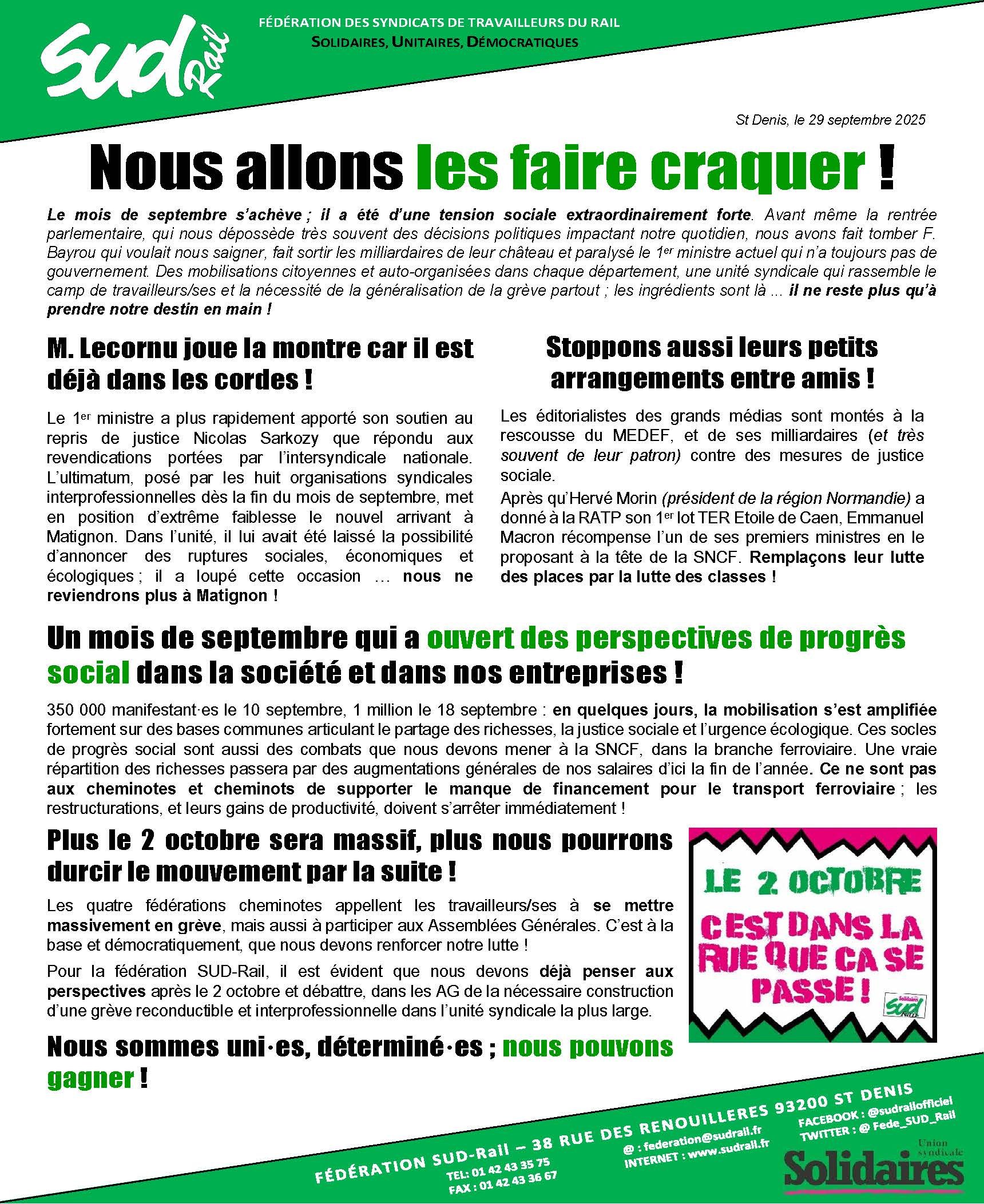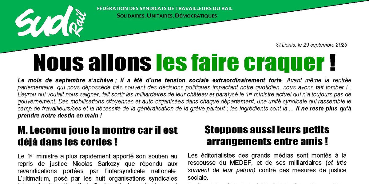Le mois de septembre s’achève ; il a été d’une tension sociale extraordinairement forte. Avant même la rentrée parlementaire, qui nous dépossède très souvent des décisions politiques impactant notre quotidien, nous avons fait tomber F. Bayrou qui voulait nous saigner, fait sortir les milliardaires de leur château et paralysé le 1er ministre actuel qui n’a toujours pas de gouvernement. Des mobilisations citoyennes et auto-organisées dans chaque département, une unité syndicale qui rassemble le camp de travailleurs/ses et la nécessité de la généralisation de la grève partout ; les ingrédients sont là ... il ne reste plus qu’à prendre notre destin en main !