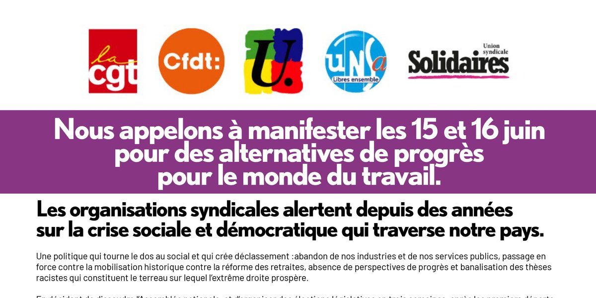 Nous appelons à manifester les 15 et 16 juin pour des alternatives de progrès pour le monde du travail.