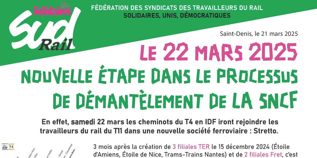 Samedi 22 mars, les cheminot·es du T4 en Ile de France iront rejoindre les travailleurs du rail et travailleuses du T11 dans une nouvelle société ferroviaire de droit privé : Stretto.
