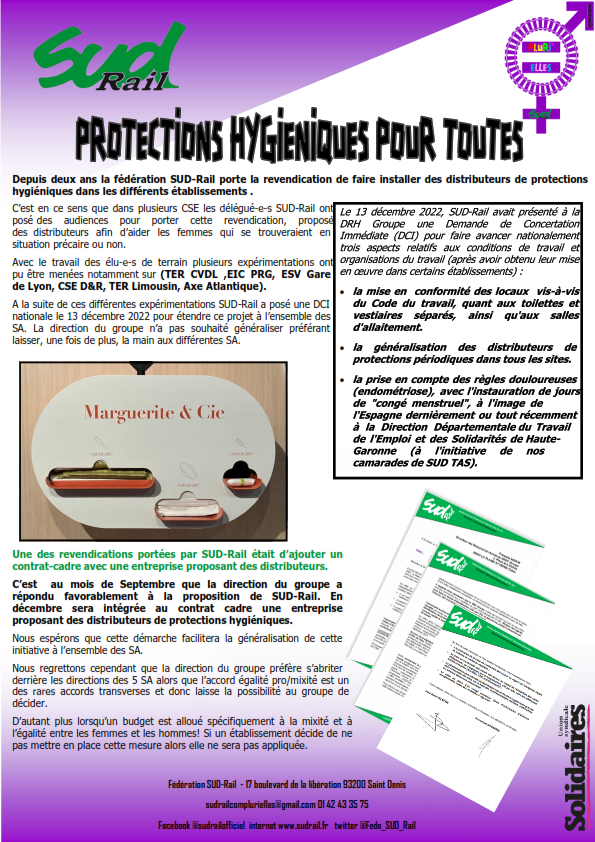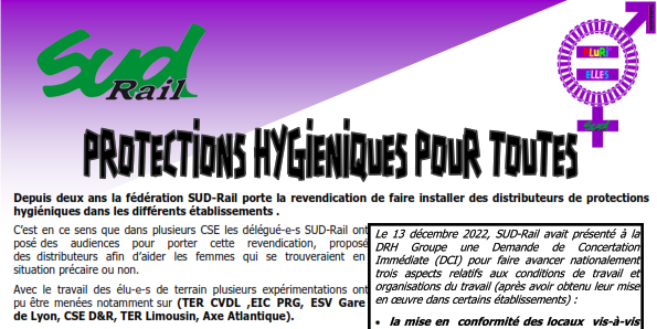 Depuis deux ans la fédération SUD-Rail porte la revendication de faire installer des distributeurs de protections hygiéniques dans les différents établissements . C’est en ce sens que dans plusieurs CSE les délégué-e-s SUD-Rail ont posé des audiences pour porter cette revendication, proposé des distributeurs afin d’aider les femmes qui se trouveraient en situation précaire ou non.