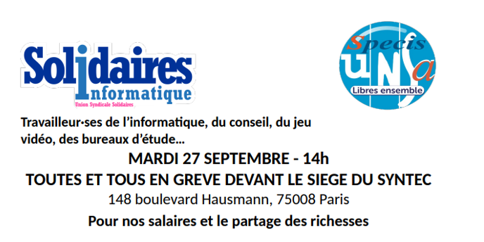 Les syndicats Solidaires informatique, UNSA-Specis s’associent pour un appel à la grève le 27 Septembre. Dans la tech comme dans tous les secteurs professionnels et face à l’inflation qui frappe durement, il est urgent d’augmenter les salaires !