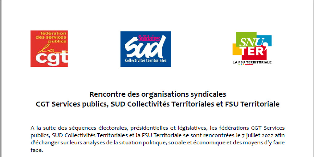 A la suite des séquences électorales, présidentielles et législatives, les fédérations CGT Services publics, SUD Collectivités Territoriales et la FSU Territoriale se sont rencontrées le 7 juillet 2022 afin d’échanger sur leurs analyses de la situation politique, sociale et économique et des moyens d’y faire face.