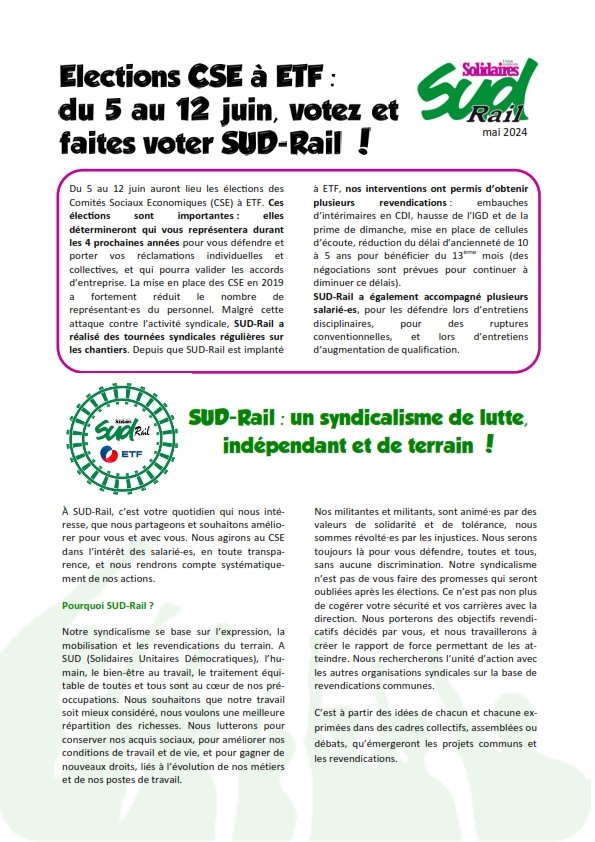 Du 5 au 12 juin auront lieu les élections des Comités Sociaux Economiques (CSE) à ETF. Ces élections à ETF, nos interventions ont permis d’obtenir plusieurs revendications : embauches sont importantes : elles détermineront qui vous représentera durant les 4 prochaines années pour vous défendre et porter vos réclamations individuelles et d’intérimaires en CDI, hausse de l’IGD et de la prime de dimanche, mise en place de cellules d’écoute, réduction du délai d’ancienneté de 10 à 5 ans pour bénéficier du 13ème mois (des collectives, et qui pourra valider les accords négociations sont prévues pour continuer à d’entreprise.
