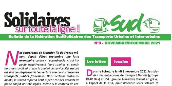 Solidaires sur toute la ligne : le bulletin d'informations de la fédération Sud/Solidaires des Transports Urbains et Interurbains. Numéro 3 : novembre/décembre 2021.