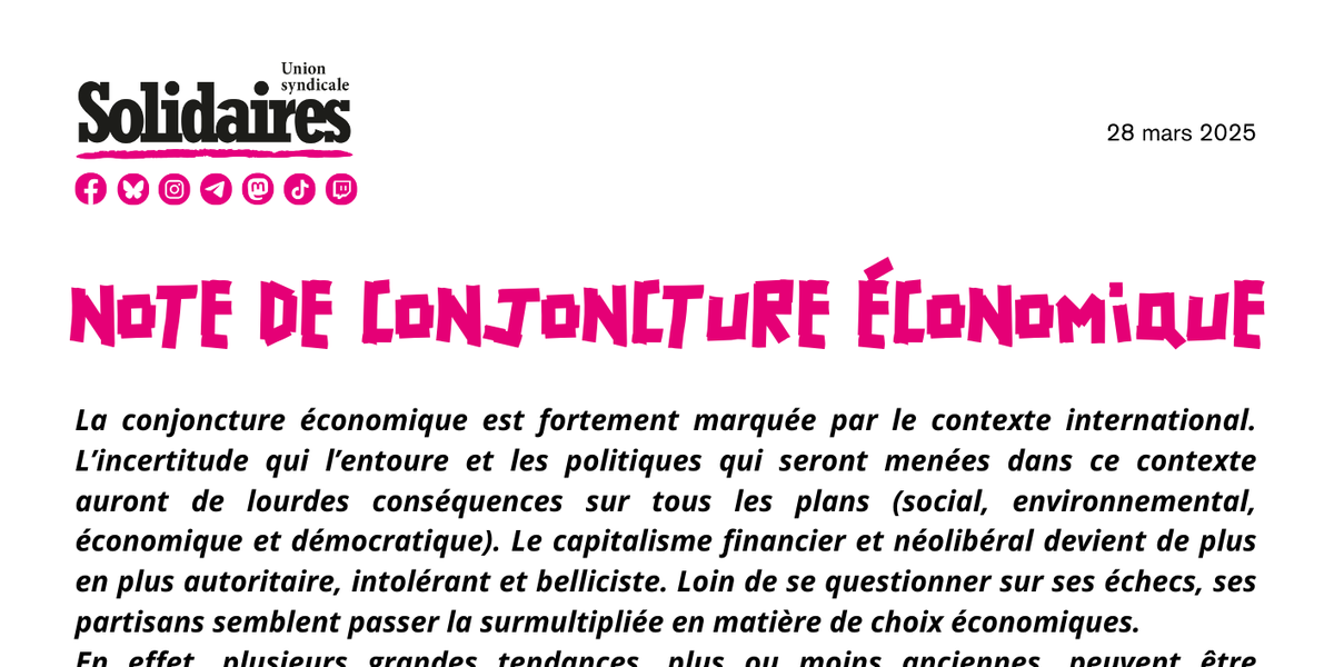 La conjoncture économique est fortement marquée par le contexte international. L’incertitude qui l’entoure et les politiques qui seront menées dans ce contexte auront de lourdes conséquences sur tous les plans (social, environnemental, économique et démocratique). Le capitalisme financier et néolibéral devient de plus en plus autoritaire, intolérant et belliciste. Loin de se questionner sur ses échecs, ses partisans semblent passer la surmultipliée en matière de choix économiques.
