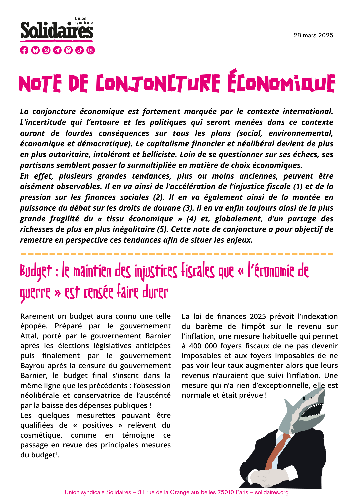 En effet, plusieurs grandes tendances, plus ou moins anciennes, peuvent être aisément observables. Il en va ainsi de l’accélération de l’injustice fiscale (1) et de la pression sur les finances sociales (2). Il en va également ainsi de la montée en puissance du débat sur les droits de douane (3). Il en va enfin toujours ainsi de la plus grande fragilité du « tissu économique » (4) et, globalement, d’un partage des richesses de plus en plus inégalitaire (5). Cette note de conjoncture a pour objectif de remettre en perspective ces tendances afin de situer les enjeux.