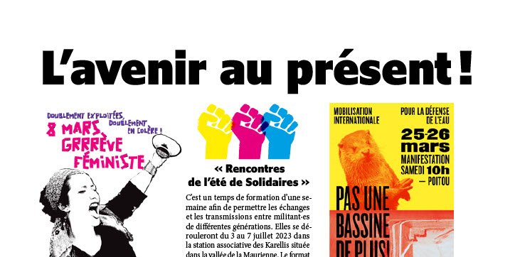 C’est un temps de formation d’une semaine afin de permettre les échanges et les transmissions entre militant·es de différentes générations. Elles se dérouleront du 3 au 7 juillet 2023 dans la station associative des Karellis située dans la vallée de la Maurienne. Le format prévu est de 150 stagiaires inscrit·es par l’ensemble de nos structures. https://solidaires.org/se-former/catalogue-des-formations/rencontres-de-lete-2023/