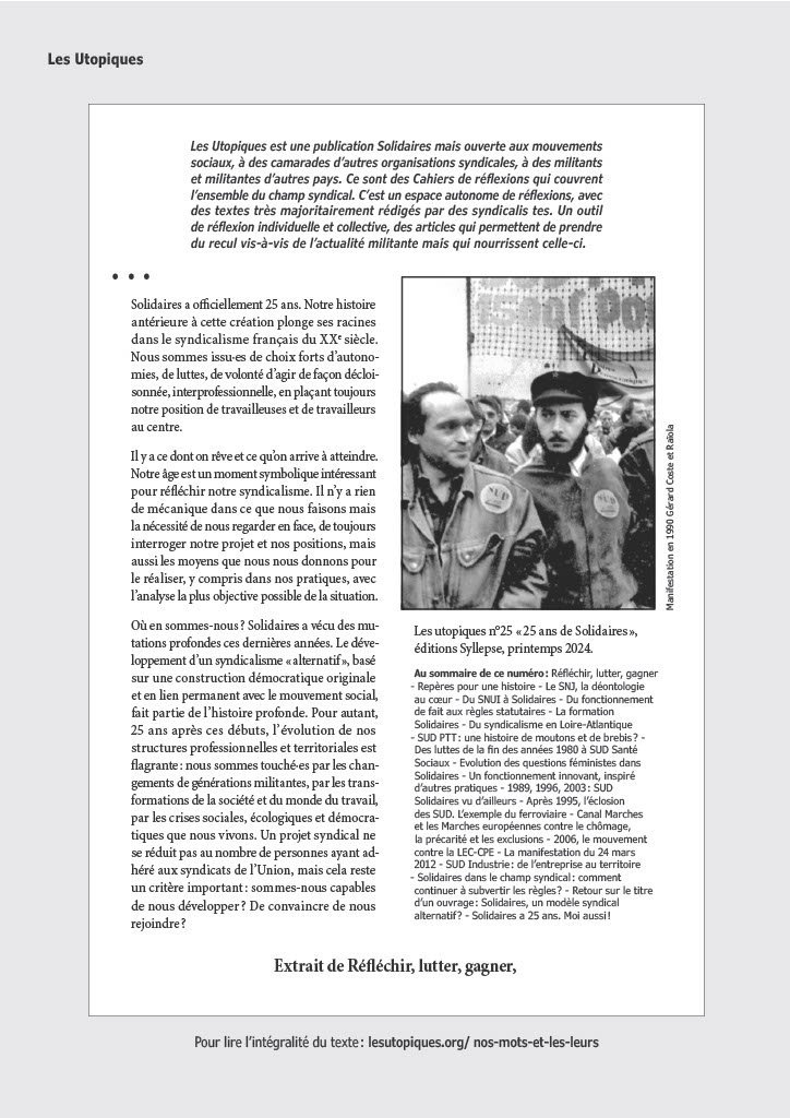 Extrait de Réfléchir, lutter, gagner, Les utopiques n°25 « 25 ans de Solidaires », éditions Syllepse, printemps 2024.