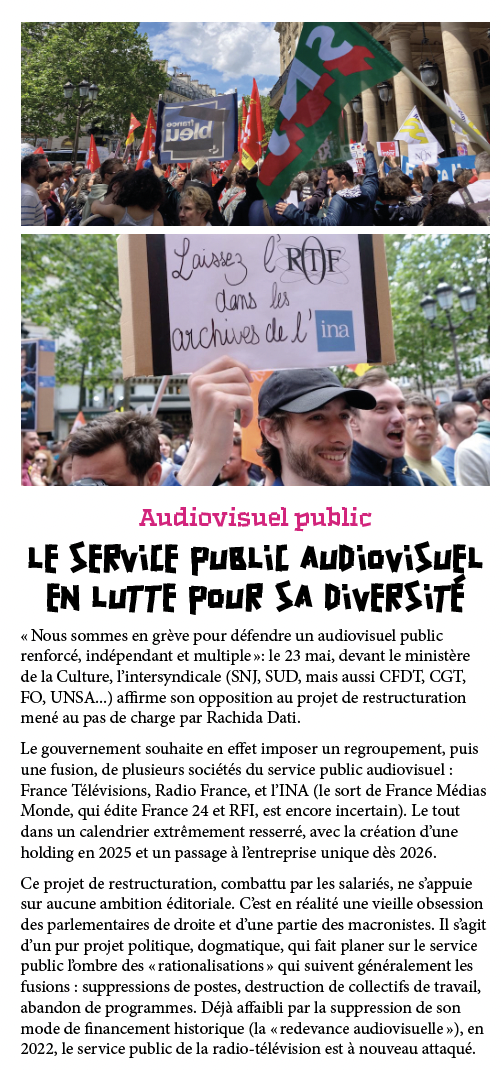 Ce projet de restructuration, combattu par les salariés, ne s’appuie sur aucune ambition éditoriale. C’est en réalité une vieille obsession des parlementaires de droite et d’une partie des macronistes. Il s’agit d’un pur projet politique, dogmatique, qui fait planer sur le service public l’ombre des « rationalisations » qui suivent généralement les fusions : suppressions de postes, destruction de collectifs de travail, abandon de programmes. Déjà affaibli par la suppression de son mode de financement historique (la « redevance audiovisuelle »), en 2022, le service public de la radio-télévision est à nouveau attaqué.