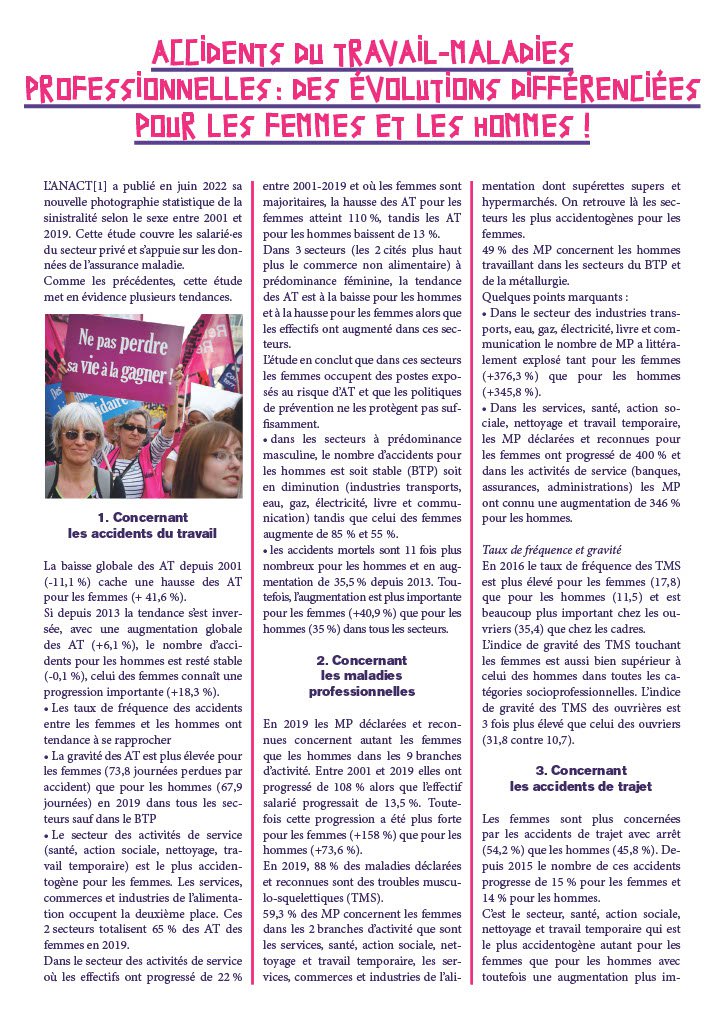 En revanche il est important que les équipes syndicales s’efforcent d’avoir une approche genrée des conditions et de l’organisation de travail, dans l’analyse des risques professionnels pour réduire et limiter les atteintes à la santé des travailleuses du fait du travail. Pour initier cette démarche il peut être intéressant de partir des indicateurs sexués et d’interroger les raisons pour lesquelles les femmes ont plus d’accidents ou de TMS dans cet atelier, ce service. Une enquête syndicale peut produire des leviers d’action intéressants pour progresser dans la prévention en faveur de toutes et tous.