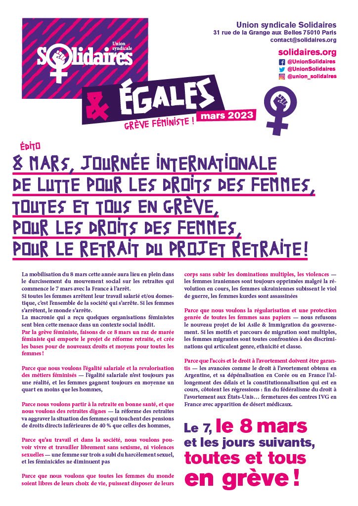 Par la grève féministe, faisons de ce 8 mars un raz de marée féministe qui emporte le projet de réforme retraite, et crée les bases pour de nouveaux droits et moyens pour toutes les femmes !