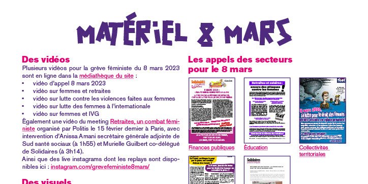 Plusieurs vidéos pour la grève féministe du 8 mars 2023 sont en ligne dans la médiathèque du site : https://solidaires.org/sinformer-et-agir/mediatheque/videos/