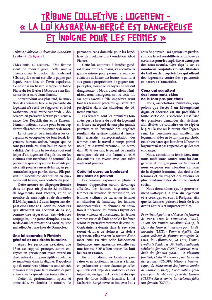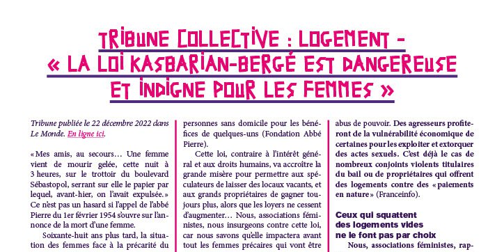Cette loi, contraire à l’intérêt général et aux droits humains, va accroître la grande misère pour permettre aux spéculateurs de laisser des locaux vacants, et aux grands propriétaires de gagner toujours plus, alors que les loyers ne cessent d’augmenter… Nous, associations féministes, nous insurgeons contre cette loi, car nous savons qu’elle impactera avant tout les femmes précaires qui vont être précipitées dans des situations de détresse extrême.