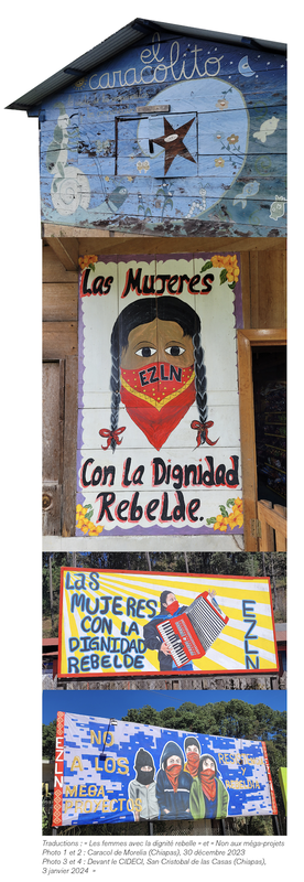 L’Armée zapatiste de libération nationale (EZLN : Ejército Zapatista de Liberación Nacional) a été fondée le 17 novembre 1983 dans les montagnes du sud-est mexicain (il y a 40 ans). Ce groupe de guérilleros se revendiquant du Che Guevara s’installe dans un territoire habité par des Mayas et leur projet révolutionnaire s’imprègne de leur culture et de leur langue. Leurs façons de penser se transforment profondément avec l’intégration de femmes et d’hommes principalement Tzeltales et Tzotziles (cultures mayas) : le projet de soulèvement armé se consolide, la place de la vie communautaire maya devient centrale, avec une importante participation des femmes qui imposent la loi révolutionnaire des femmes pour l’égalité en 1993. Ce sont les peuples zapatistes qui votent le soulèvement en 1993.