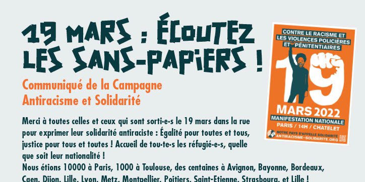 Merci à toutes celles et ceux qui sont sorti·e·s le 19 mars dans la rue pour exprimer leur solidarité antiraciste : Égalité pour toutes et tous, justice pour tous et toutes ! Accueil de tou·te·s les réfugié·e·s, quelle que soit leur nationalité !